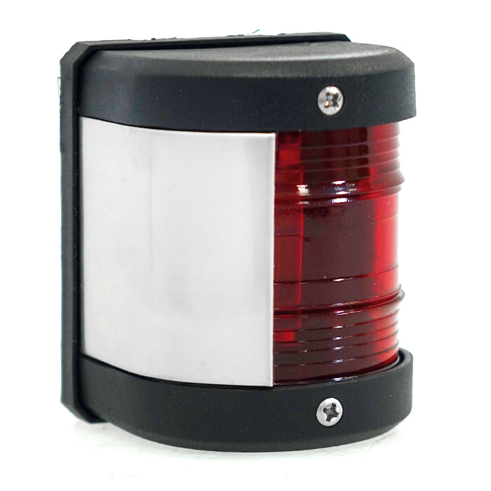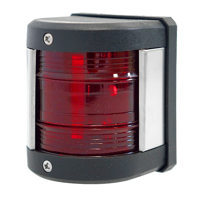 Левый отличительный — красный, сектор освещения 112,5° (10 румбов), освещает дугу горизонта от направления прямо по носу до двух румбов влево позади траверза.