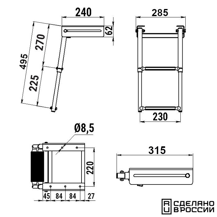 Трап телескопический выдвижной, 2 черных ступени (ширина 285 мм.)